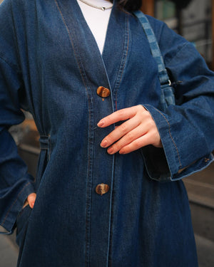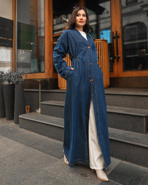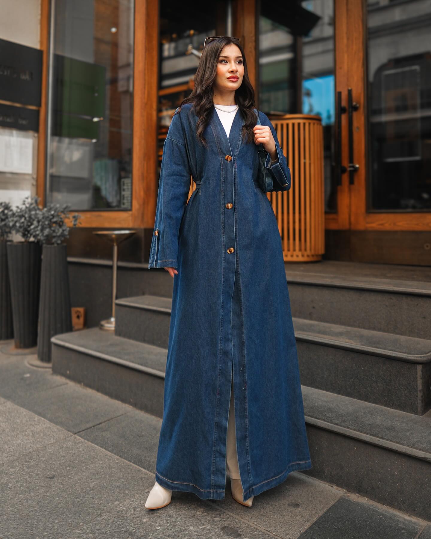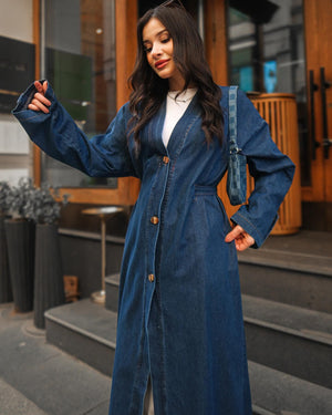 معطف جينز طويل للنساء – تصميم عصري أنيق بستايل ترنش كوت