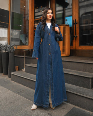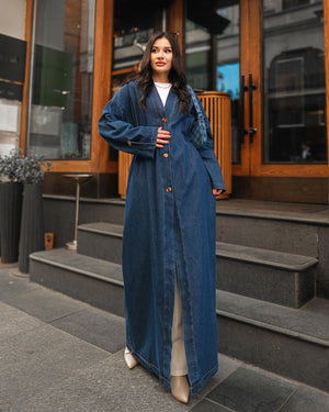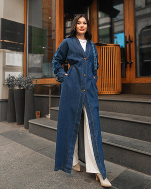 يأتي بتصميم طويل مستقيم مع ياقة بسيطة تمنح مظهرًا كلاسيكيًا أنيقًا، وأزرار أمامية خشبية تضيف دفئًا للتفاصيل. الأكمام الواسعة تمنح حرية حركة وأناقة مريحة، فيما تُبرز الخياطة الدقيقة عند الخصر جمال القوام وتُضفي لمسة من الرشاقة.